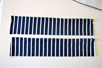 Шаг 2. По ширине верхнего среза юбки отрезаем две детали пояса из рукавов. Скалываем детали и сшиваем.
