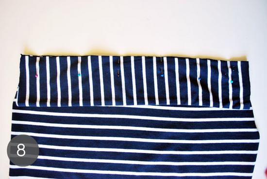 Шаг 3. Пояс складываем пополам и пришиваем к верхнему срезу юбки.
