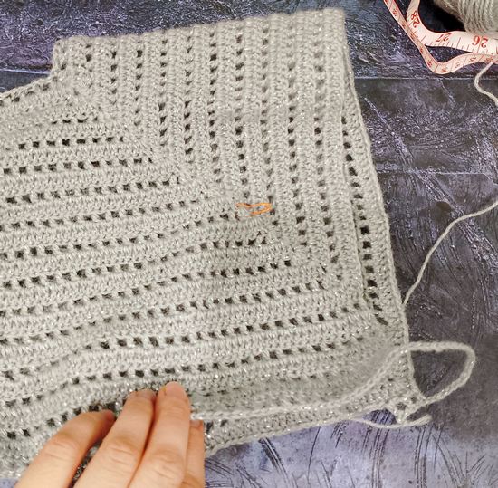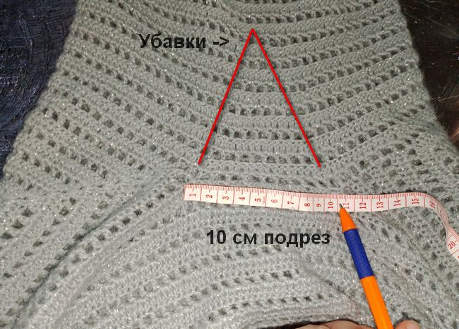 В каждом втором ряду убавляла по две петли в начале и в конце подреза. Делала это в ряду, где вяжутся одни столбики с накидом. Для убавки провязывала 2 столбика с единой вершиной. Убавки делала на встречу друг другу, по принципу убавок на рукаве при вязании спицами, когда подмышкой формируется клин.