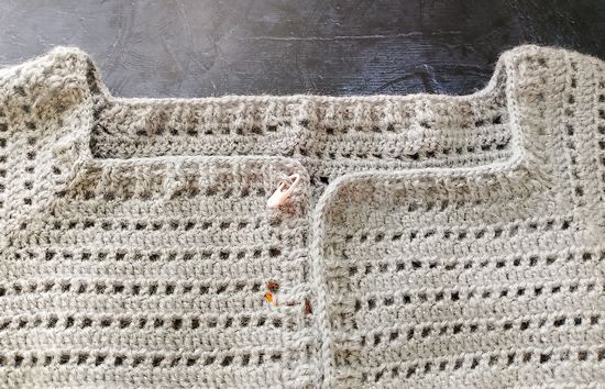 На углублениях на горловине (в местах реглана) вязала 3 ст.с.н под нижний ряд, чтобы не было большой дырки.