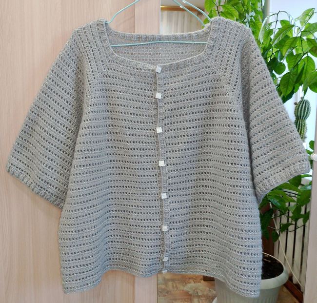 Жакет с простым геометрическим узором связан регланом сверху. Рукава, горловина и планки обработаны крючком рельефными столбиками. Связан на размер 50-52 с достаточно большой свободой облегания. Если увеличить длину, изделие можно смело назвать кардиганом. В остальном отличий в вязании нет.